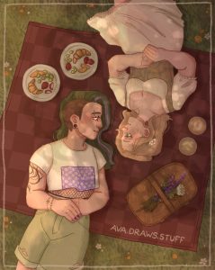 Carlson said their piece called “Eva + Lola” is a really sweet show of their growth as a person and an artist. “The characters represented in the piece are based on real people in my life. It’s been very sweet to hold onto that younger self while seeing my current self grow up and change into a totally different version of me. The piece itself is also a revisitation of a series I made back in 2021 in which I drew a bunch of my characters in various spaces as a practice in backgrounds and character design. I revisited the series in January of this year and have been redrawing the pieces with my current style and skills, so it’s been really cool to see my growth as an artist through those redraws.”