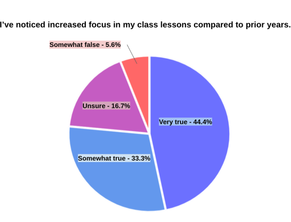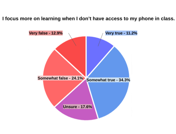 Reactions among students in a similar anonymous survey are more mixed, with a relatively even split on if the cell phone policy increases focus and productivity in class or not. A lot of students commented criticisms of the policy, saying it’s too strict, that music from their phone helps them focus, or that they don’t believe the policy is that effective.